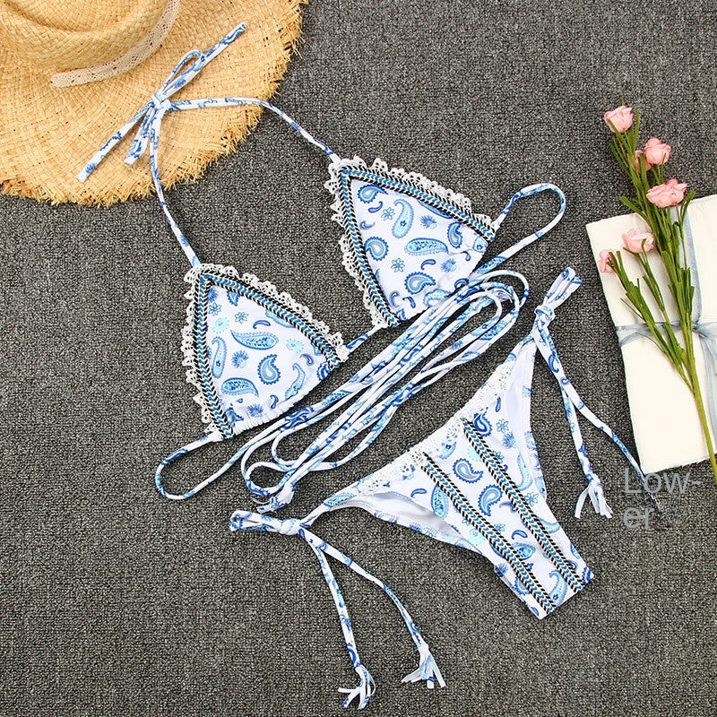 Cross-border Separated Swimsuit for Women European and American Style Sexy Webbing Splicing Lace-up Printed Bikini