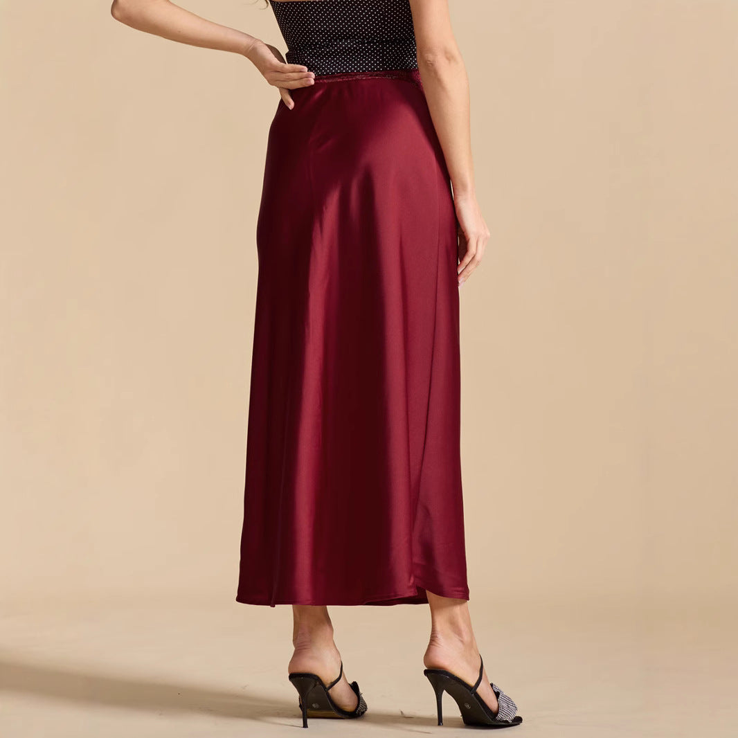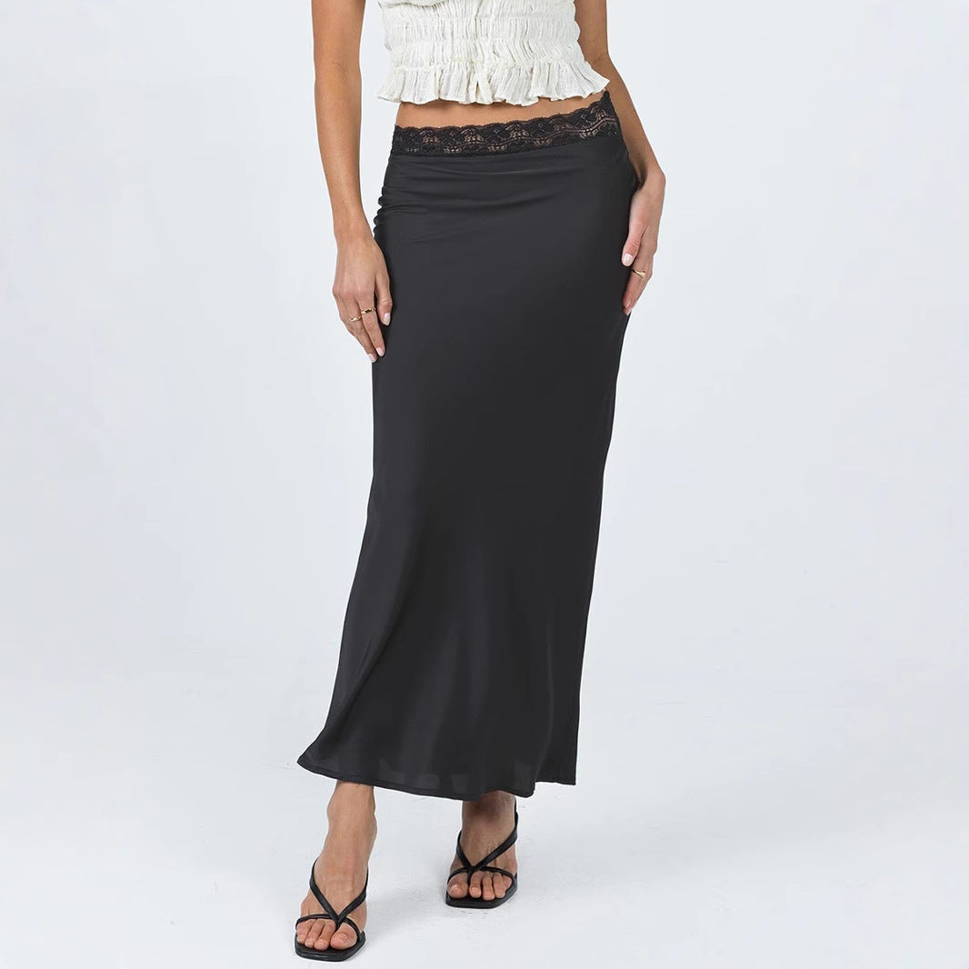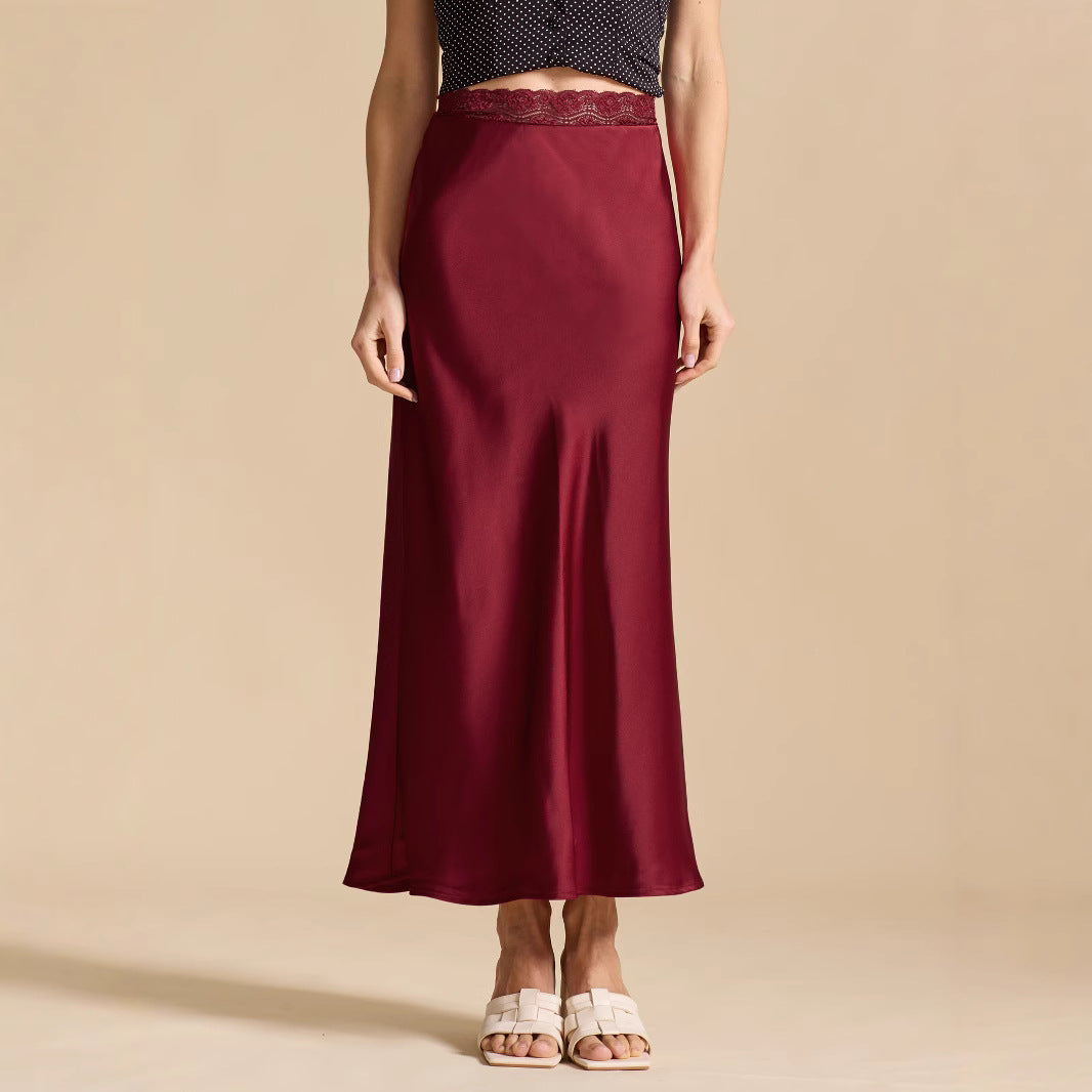 Lace Waist Satin Skirt Elastic Fitted Long Skirt Women
