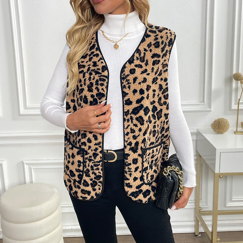 V-Neck Sleeveless Vest Women's Tank Top Leopard Print Open Cardigan Top