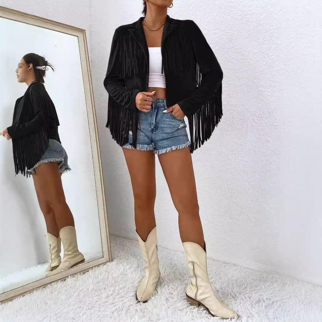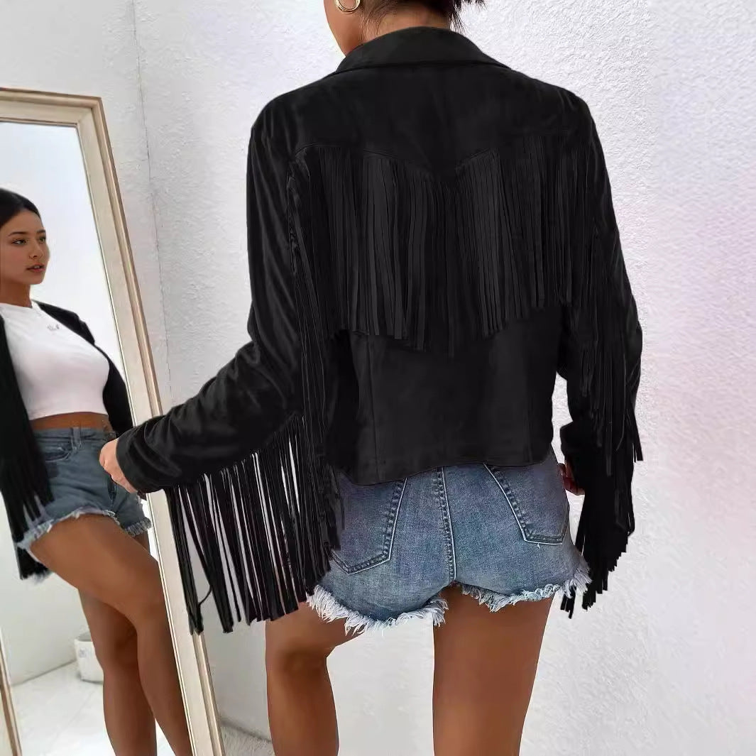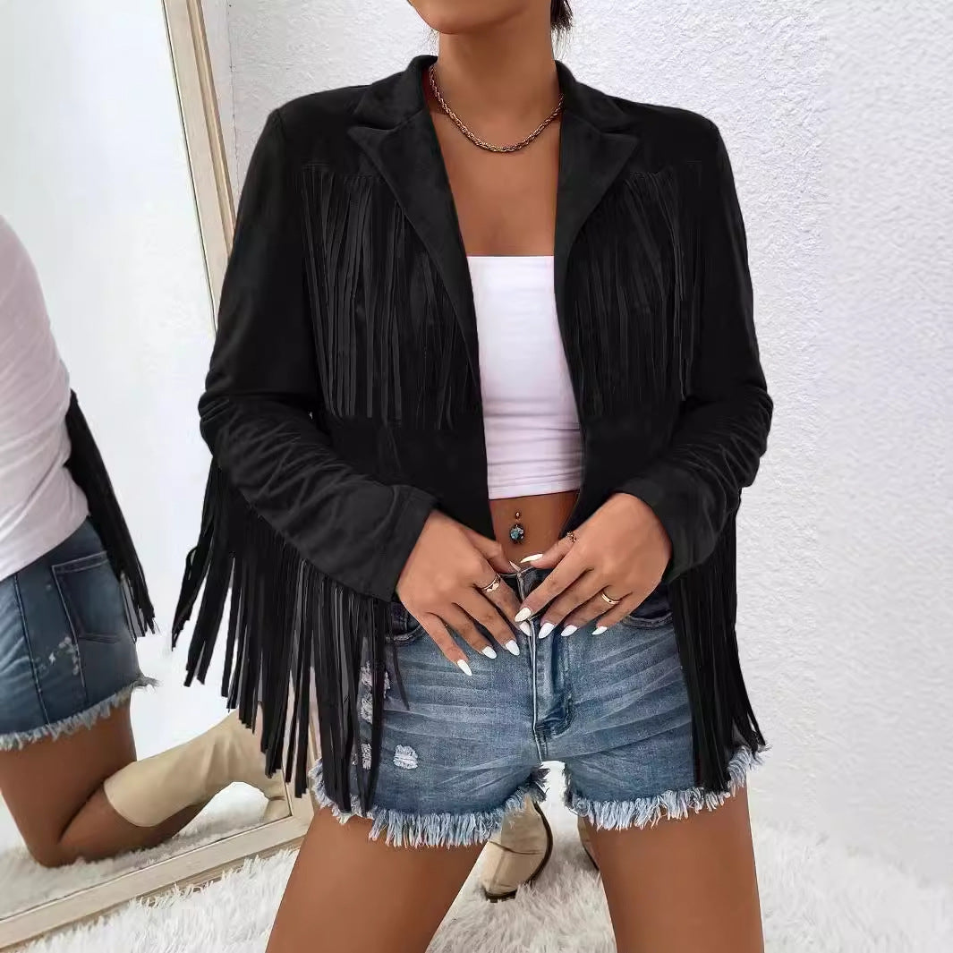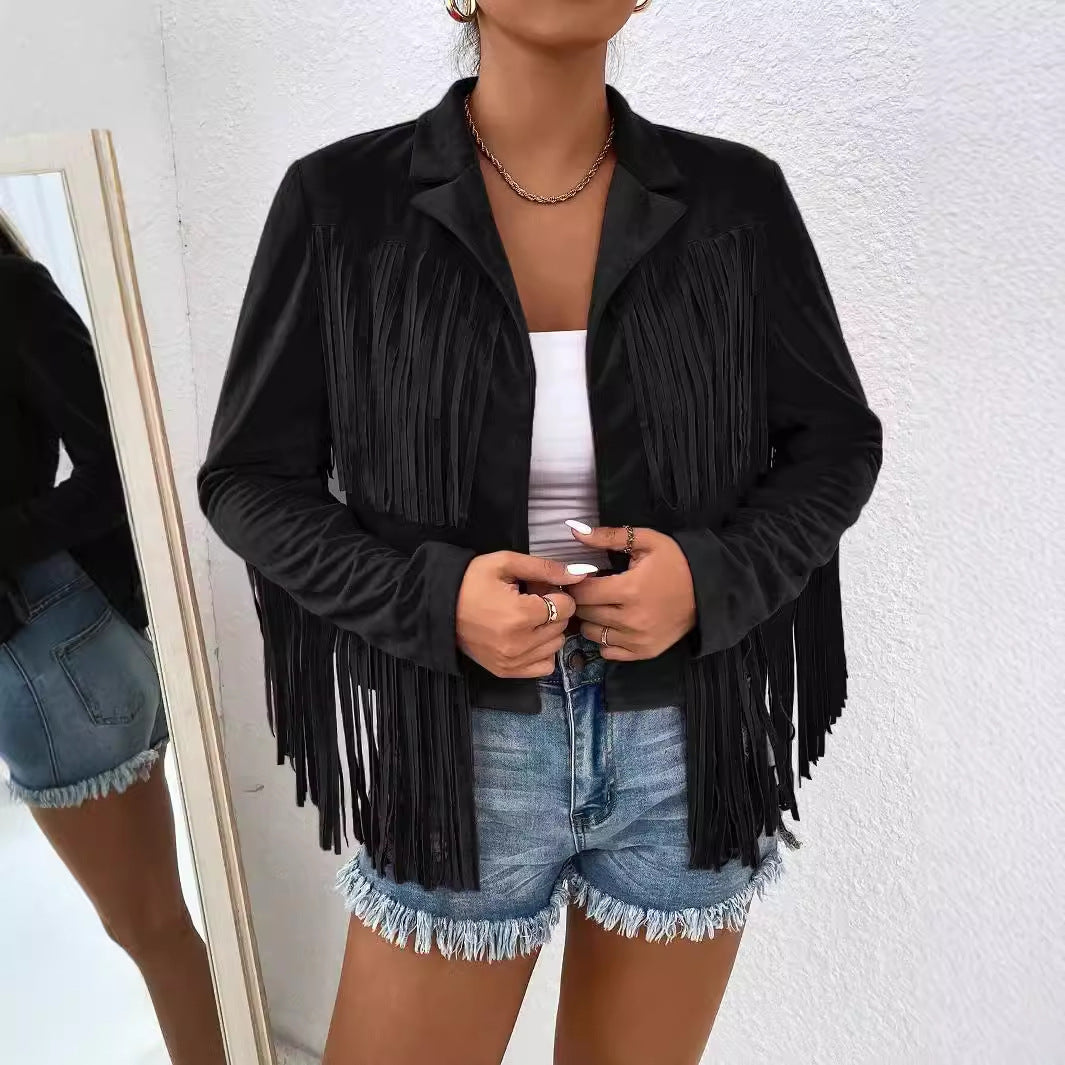 Women's Autumn and Winter New Slim Printed Tassel Long Sleeve Jacket Warm