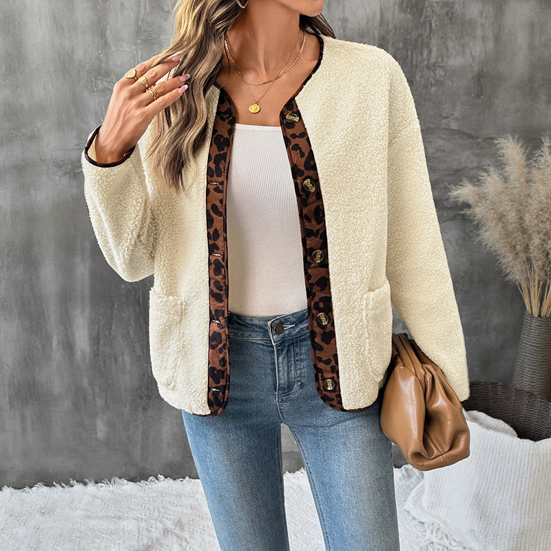 Women's Leopard Print Contrast Color-side Cardigan Thickened Polar Fleece Jacket