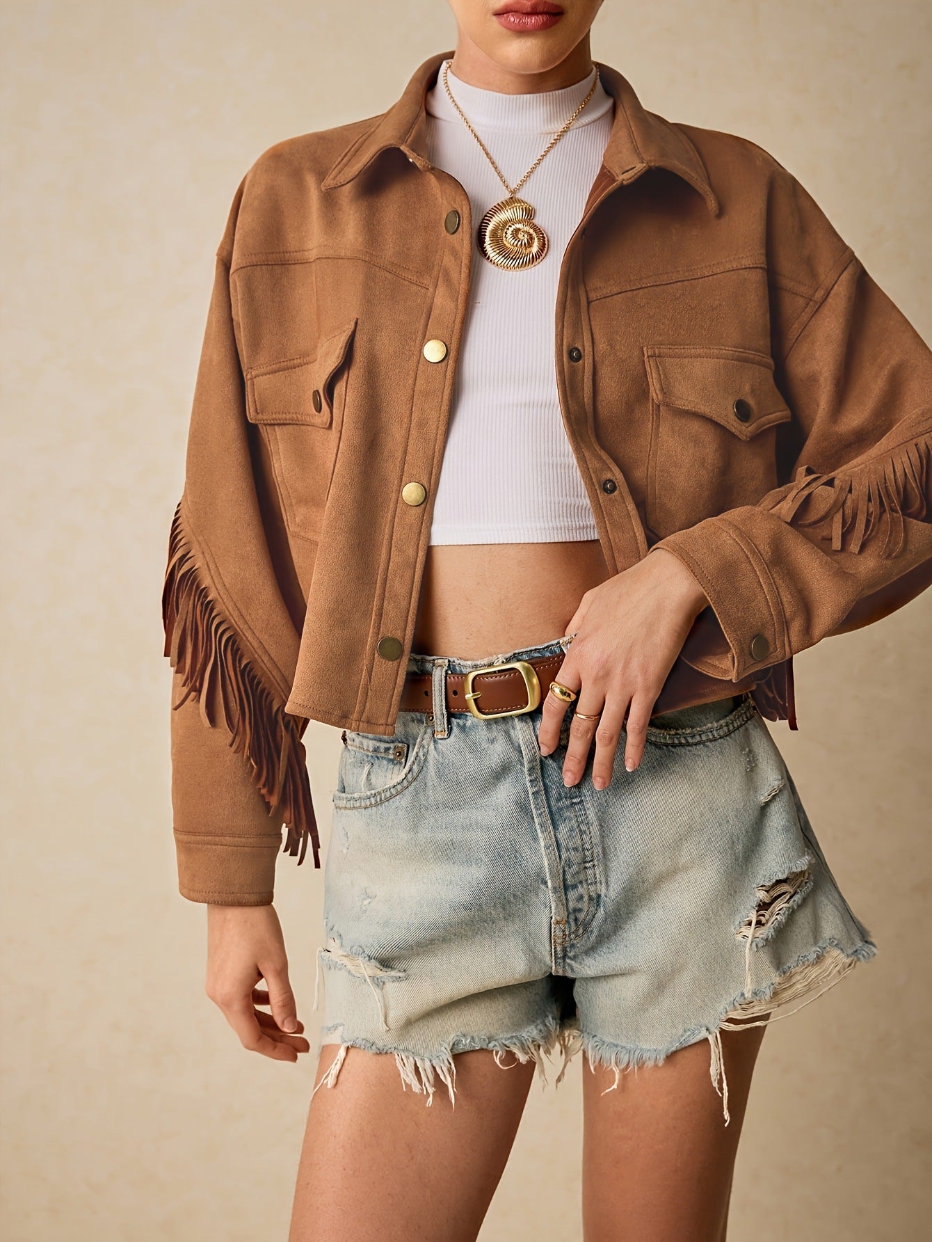 Women's Solid Color Drop Shoulder Long Sleeve Fringe Trim Casual Jacket