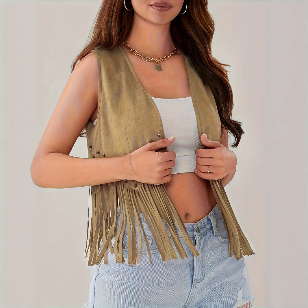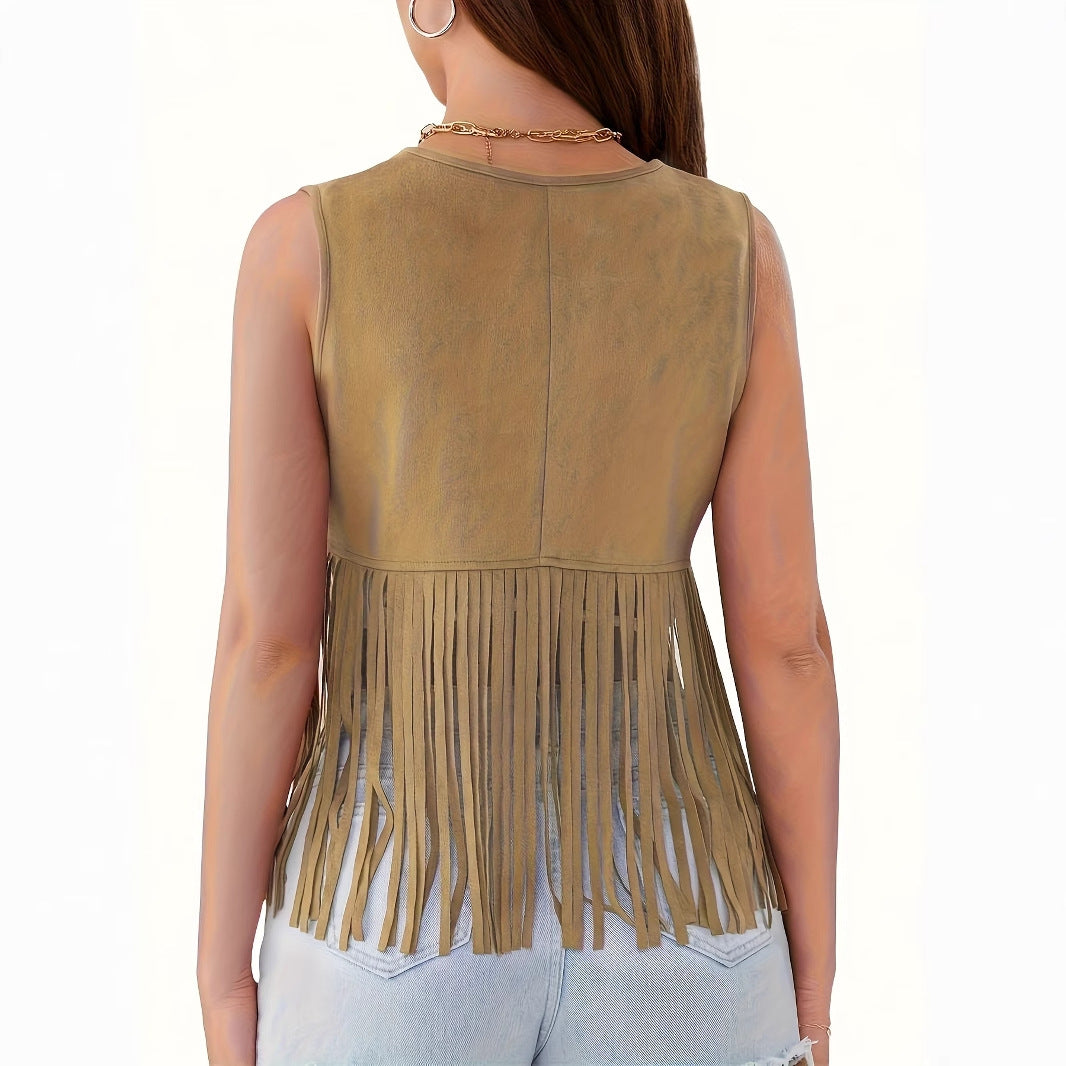 Women's Solid Color Sleeveless Faux Suede Fringe Jacket Cardigan